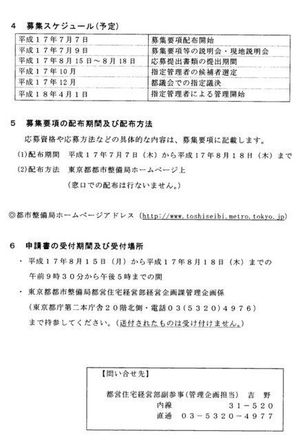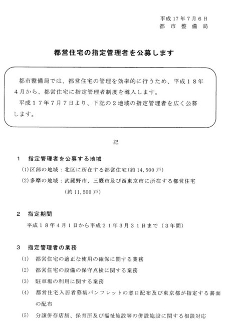 | はじめ通信5−714 都営住宅「指定管理者」で家賃徴収や建物管理などに民間企業を導入。 居住者への押しつけ許さず、問題点をズバリ追及。 ●東京都の都市整備局は、7月になって、北区の1万4千戸余りの都営住宅全部について、来年の4月から、家賃徴収などを住宅供給公社から民間企業に移すという方針を発表しました。 その文書そのものを下に転載しておきます。 いきなり、家賃などに跳ね返るわけではありませんが、じわじわと公共住宅としてのサービスが、管理する民間企業のもうけ本位にすり替えられるおそれもなしとしません。厳しい警戒と監視が必要です。 ●都の発表した文書は、以下の通りです。 ![]() ![]() |